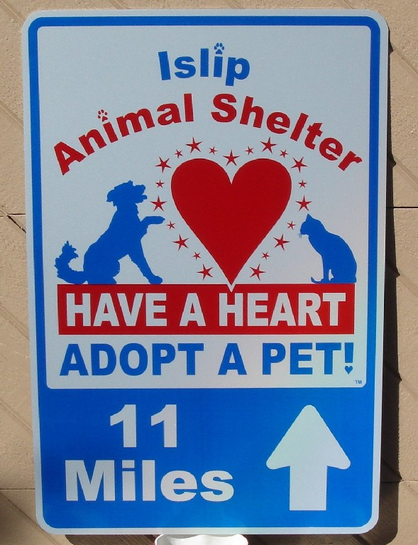 Our street signs are designed to drive traffic to local shelters. Many families choose to adopt from breeders, pet stores and organizations that import dogs from out-of-state simply because they are not aware of the location of their local municipal shelter. It is an integral part of our mission to highlight local shelters as a viable alternative to breeders. You have the ability to decide what each sign says, where they will be located and how many signs are required. They can be placed on a green background sign, if required, by state or federal traffic sign codes.